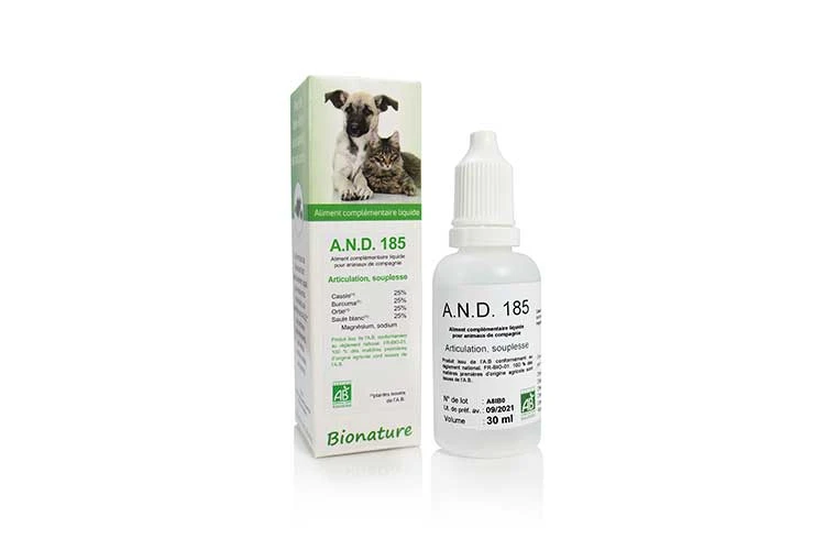 A.N.D. 185 est un Complément alimentaire naturel certifié Agriculture biologique pour chien et chat.