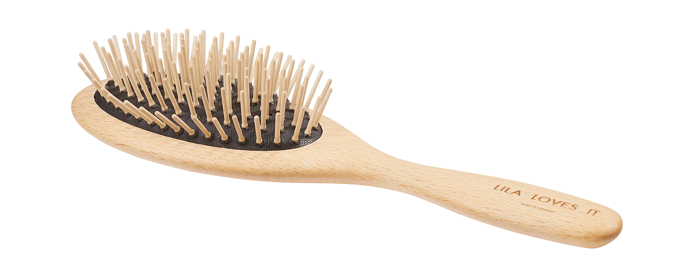 La brosse Lila Loves It est fabriquée en bois de hêtre huilé et convient parfaitement au toilettage et au massage. Les pics arrondis glissent sans effort à travers une fourrure longue ou moyenne et la démêlent qu’elle soit raide ou bouclée. L