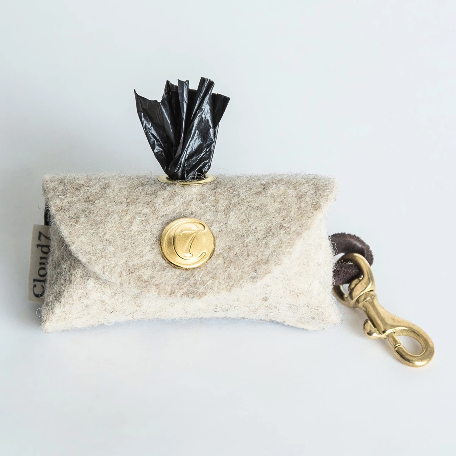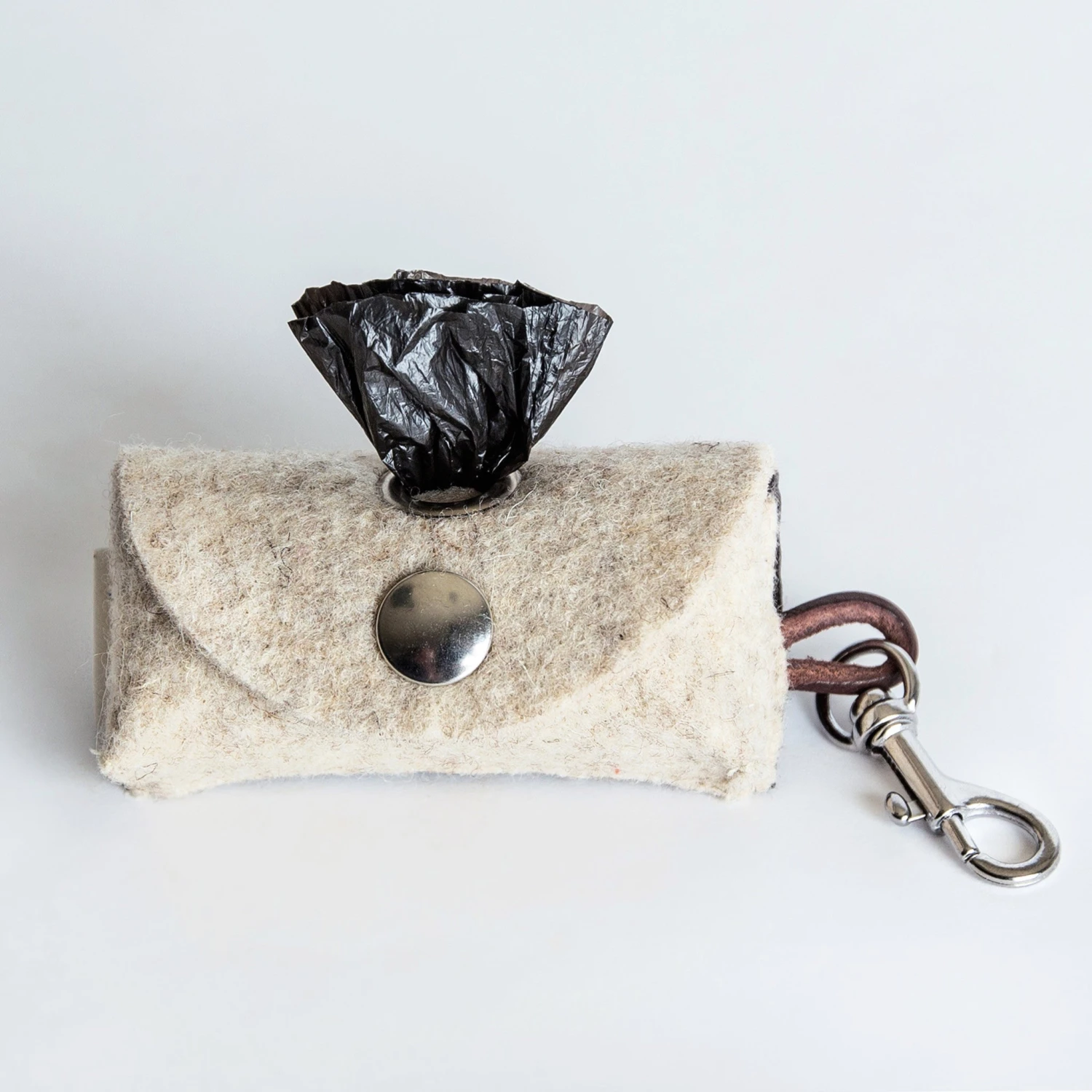 Distributeur chic de sacs d’hygiène fait en laine feutré avec mousqueton et boutons.