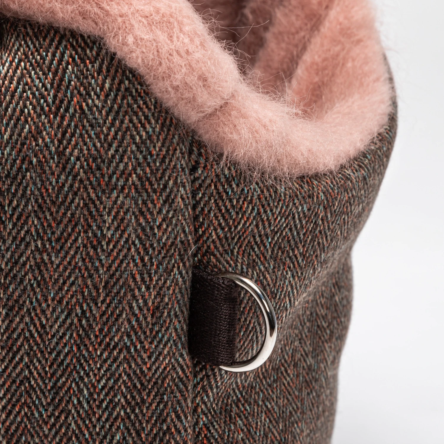 La partie extérieure du sac est fabriquée dans un tissu à chevrons multicolores délicieusement vintage tandis que la doublure offre un nid douillet à votre toutou.