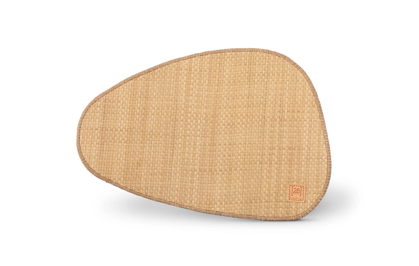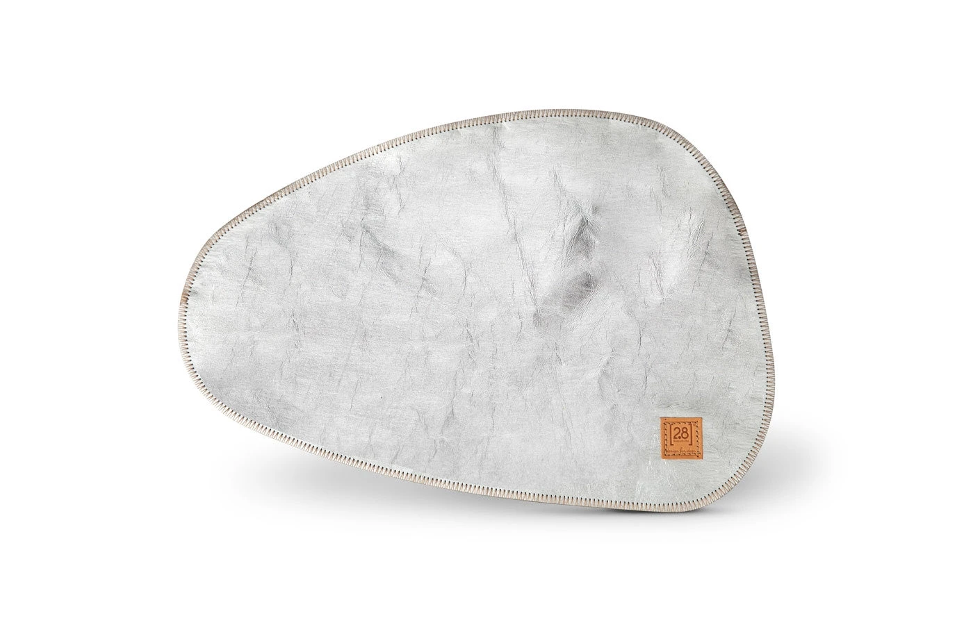 Fabriqué en papier ciré imperméable, Tina est un set de table en forme de galet qui protège vos sols des éclaboussures et des taches tout en préservant le fond des bols.