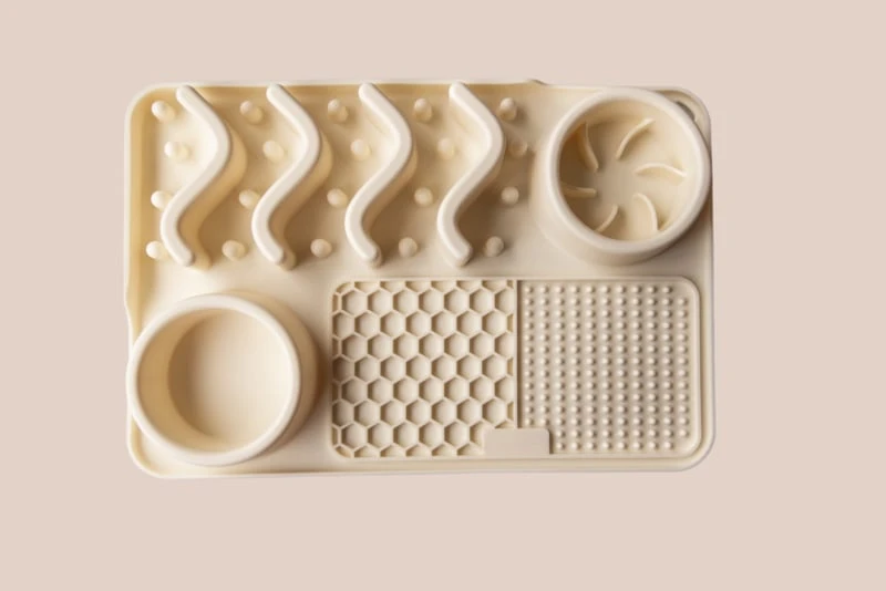 Ce joli tapis de léchage peut accueillir une grande variété d’ingrédients allant de la pâtée bien sûr à la banane écrasée en passant par les carottes bouillies. Notre astuce : déposer du yaourt ou du smoothie sur le tapis et placer le Eat, Snack & Lick au congélateur. Cela permettra d’occuper votre chien plus longtemps !